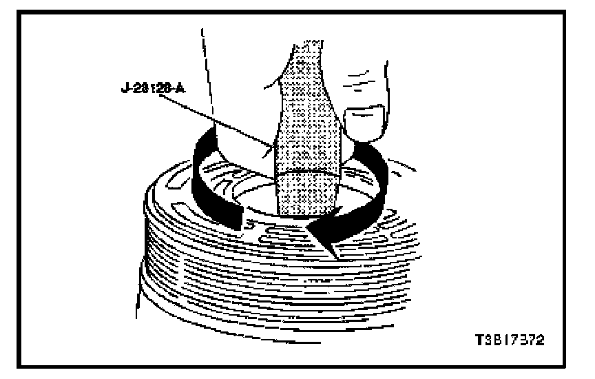 7. Fully engage the knurled tangs of the seal seat remover/installer J-23128-A into the recessed portion of the seal by turning the handle clockwise. Remove and discard the seal from the compressor with a rotating-pulling motion. The handle should be hand-tightened securely. Do not use a wrench or pliers to tighten the handle.