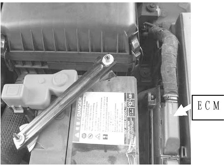 3. Disconnect negative battery cable. Loosen nut to remove battery hold down "J" bolt nearest the ECM.