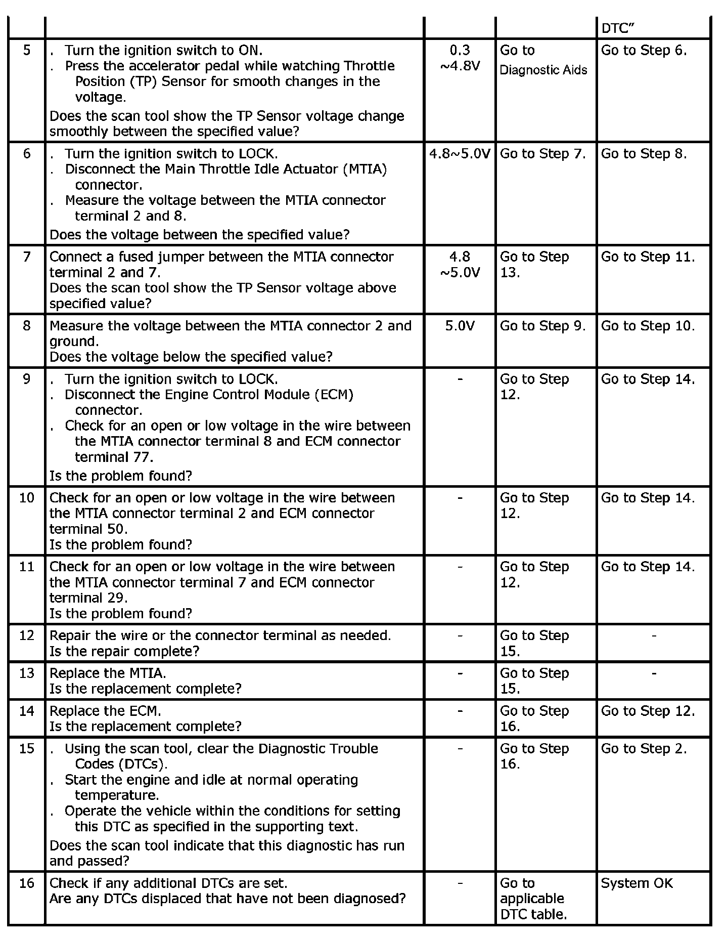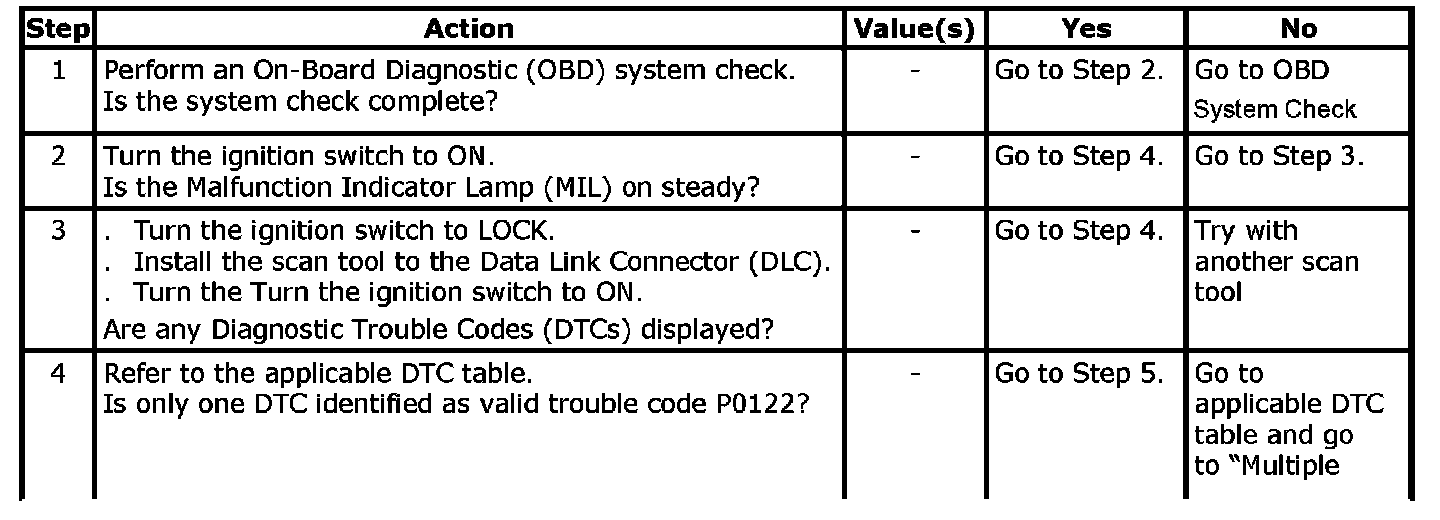 The TP sensor provides a voltage signal that changes in relation to the throttle plate angle. The signal voltage will vary from about nearly 5.0 V at idles to about 0.2 V to 0.4 V at wide-open throttle. The TP sensor is one of the most important inputs used by the ECM for fuel control and other functions such as idle, wide open throttle, deceleration enleanment, and acceleration enrichment.