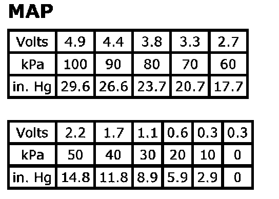 The above tables show the difference between absolute pressure and vacuum related to MAP sensor output, which appears as the top row of both tables.