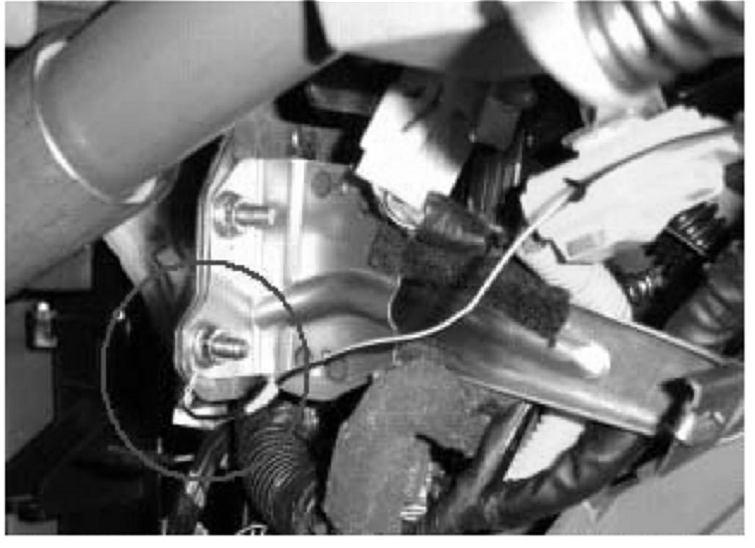 2. Before reinstalling the knee bolster attach the ground wire of the new Clock Spring to the knee bolster mounting bracket as shown.