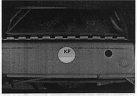 13. Affix a "KF" sticker on the radiator core support as shown in the picture. Additional stickers can be ordered through normal parts ordering procedures. See Parts Information for part number and order quantity detail.