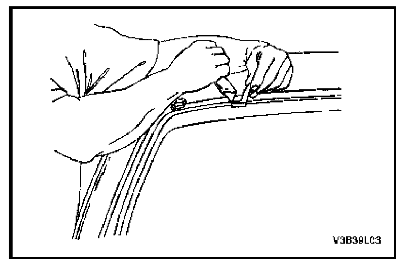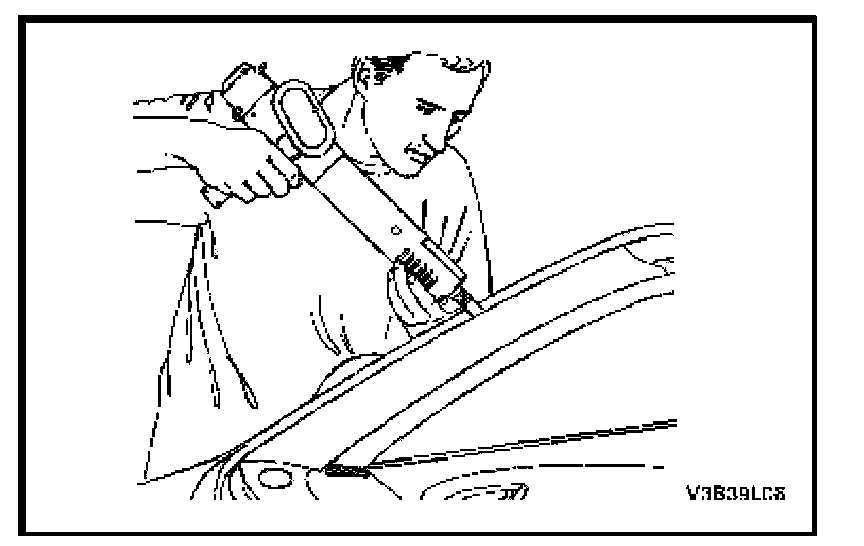 4. Using the glass sealant remover J-24402, cut the adhesive around the windshield.
