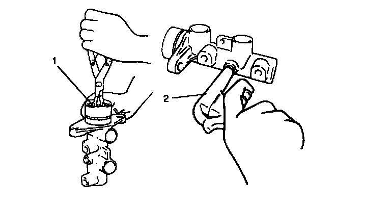 4. Remove primary piston. Then remove secondary piston by blowing compressed air (2) into hole. Be cautious during removal as secondary piston jumps out.