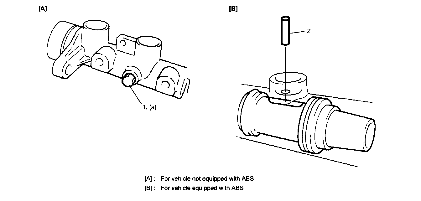 2. [For vehicle equipped with ABS] Push in primary piston (1) to remove secondary piston stopper pin (2) from master cylinder as shown.