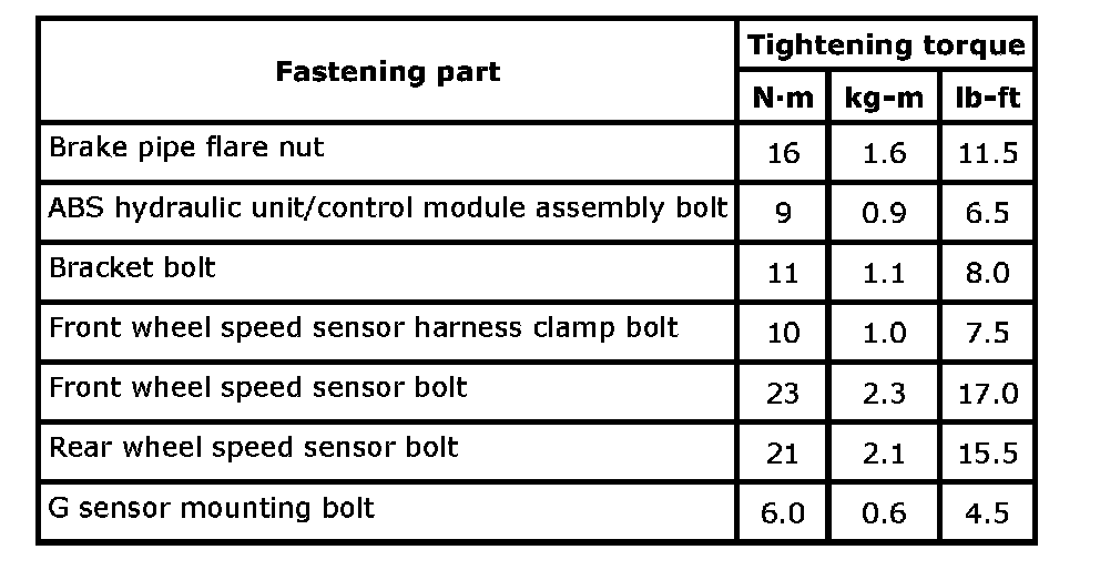 Tightening Torque SpecificationsNOTE: The specified tightening torque is also described in the following. ABS Hydraulic Unit/Control Module Assembly Components: Type 1