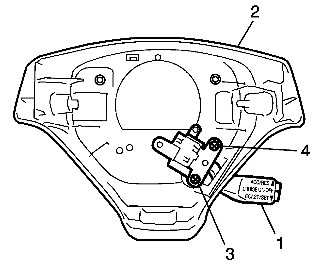 5. Remove cruise control switch assembly (1) from steering wheel lower cover (2) removing cruise control lever bolt (3) and cruise control switch assembly screw (4).