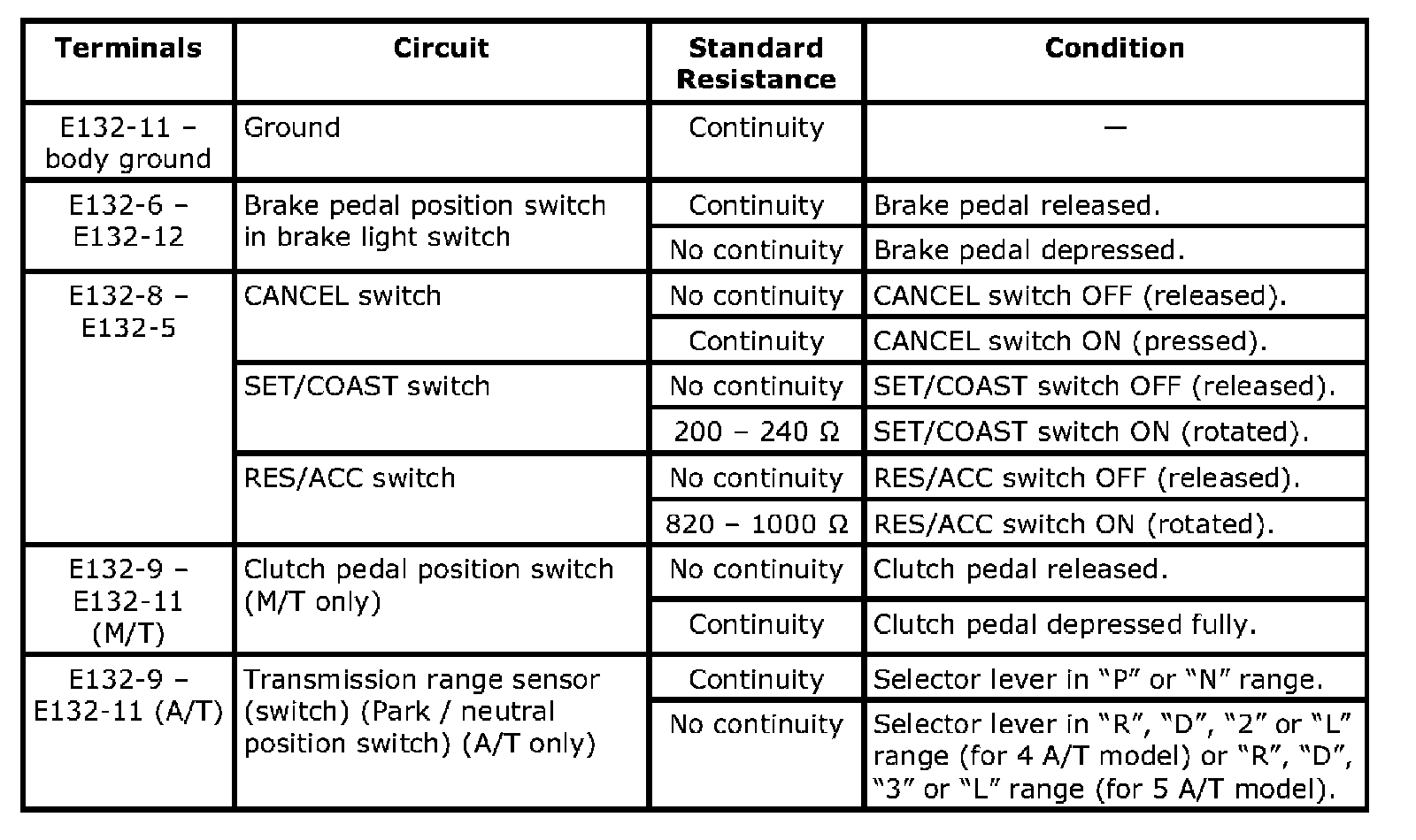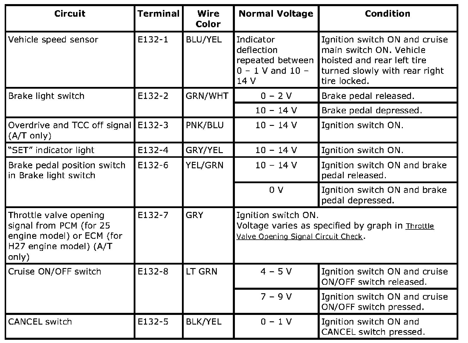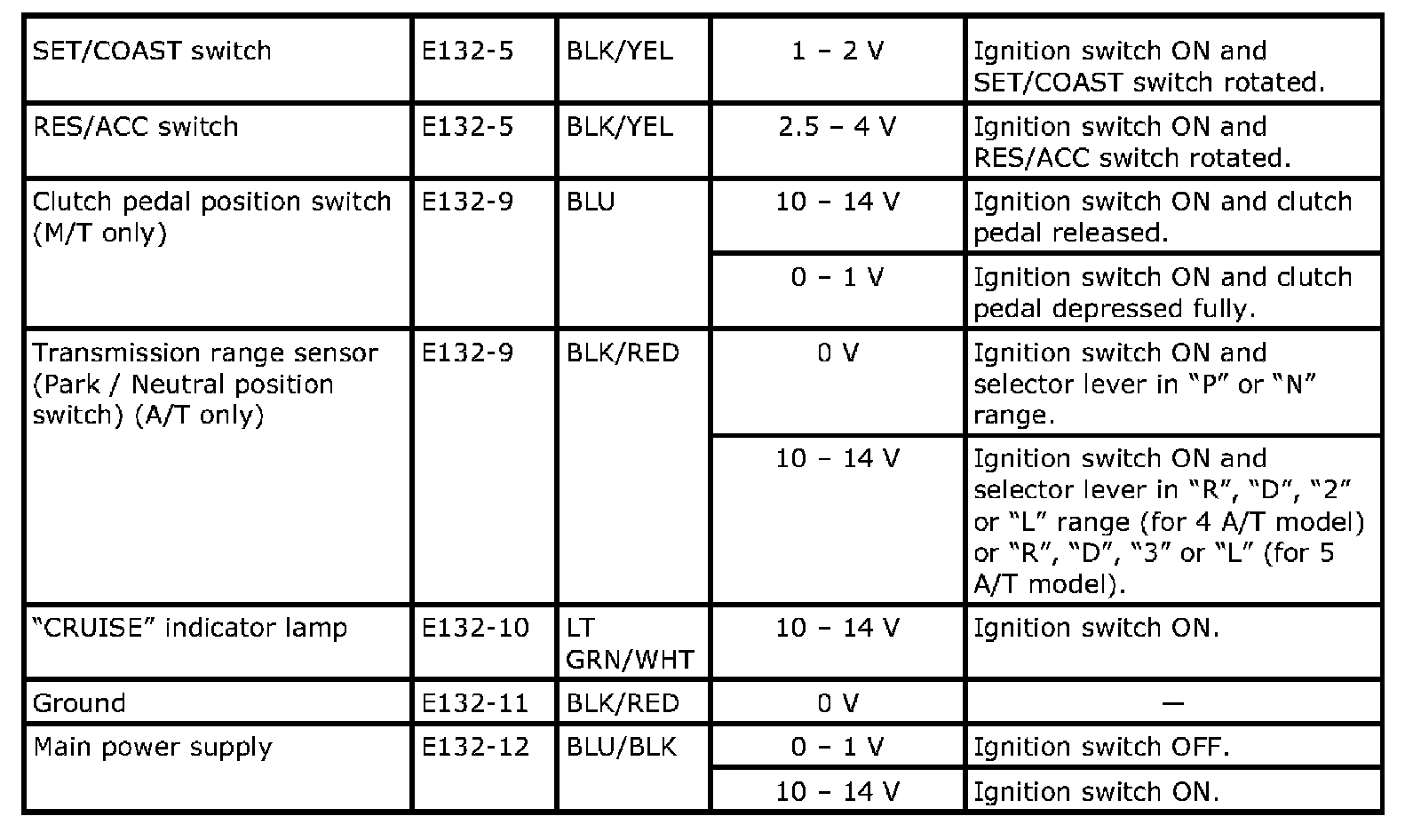 CRUISE CONTROL MODULE AND ITS CIRCUIT INSPECTIONCAUTION: Cruise control module can not be checked by itself. It is strictly prohibited to connect voltmeter or ohmmeter to cruise control module with coupler disconnected from it.