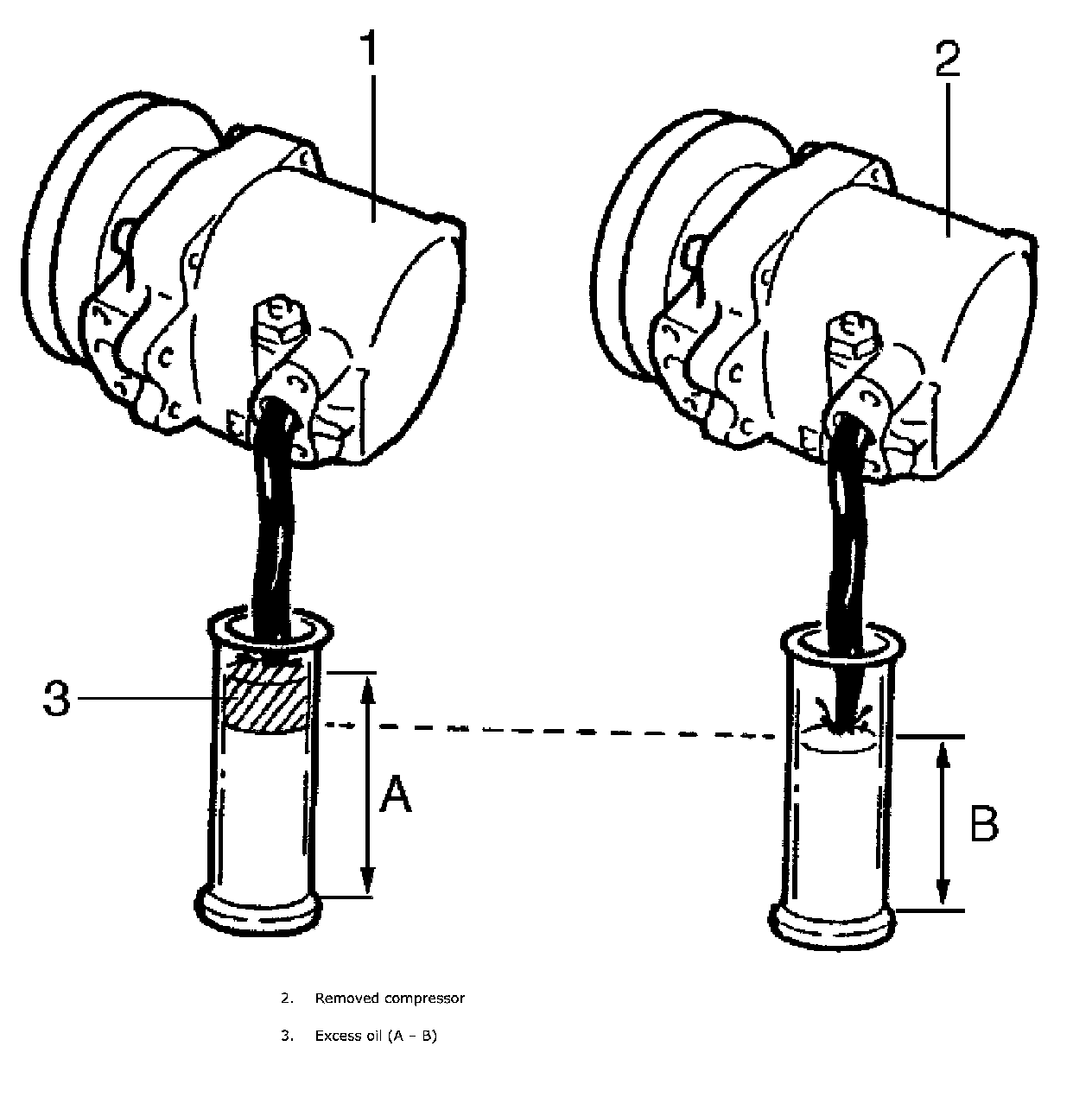 Compressor oil is sealed in each new compressor (1) by the amount required for air conditioner cycle. Therefore, when using a new compressor for replacement, drain oil from it by the amount calculated as follows.