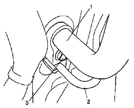 5. Disconnect suction hose (1) and condenser outlet hose (2) by removing attaching bolt (3).