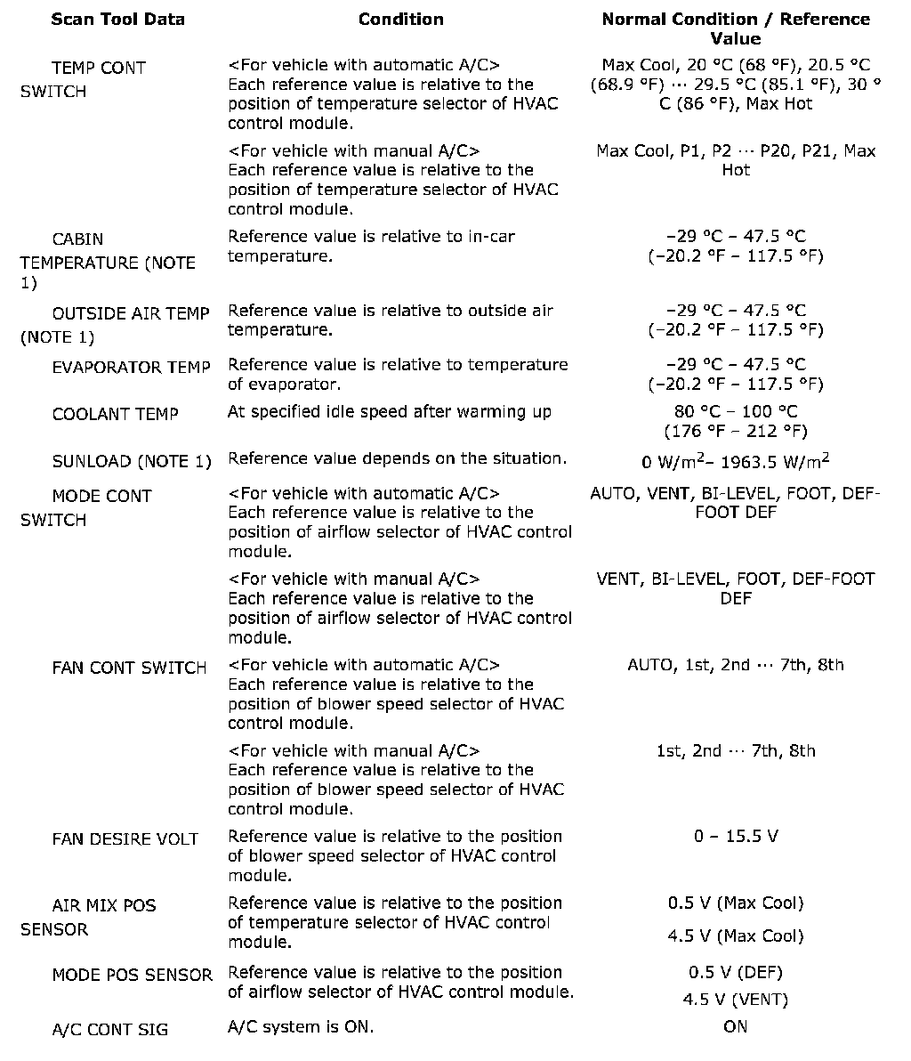 Scan Tool DataAs the data values given are standard values estimated on the basis of values obtained from the normally operating vehicles by using a scan tool, use them as reference values. Even when the vehicles are in good condition, there may be cases where the checked values do not fall within each specifies data range. Therefore, judgement as abnormal should not be made by checking with these data alone.