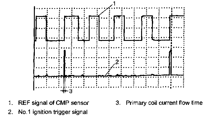 Oscilloscope waveforms of CMP sensor REF signal and No.1 ignition trigger signal are as shown in figure when connecting oscilloscope between terminal "C51-1-13" of ECM (PCM) connector connected to ECM (PCM) and ground, and between terminal "C51-2-28" and ground.