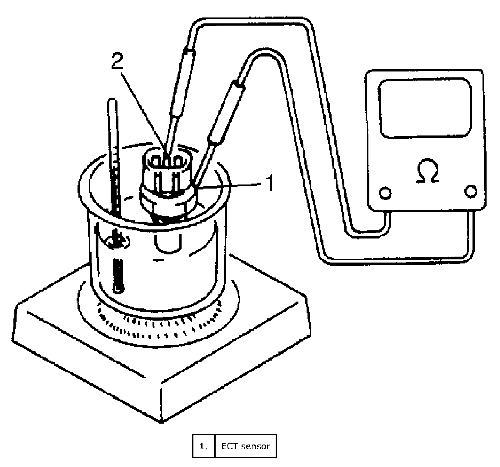 ENGINE COOLANT TEMPERATURE (ECT) SENSOR INSPECTIONWarm up sender gauge (2). Thus make sure its resistance is decreased with increase of its temperature.