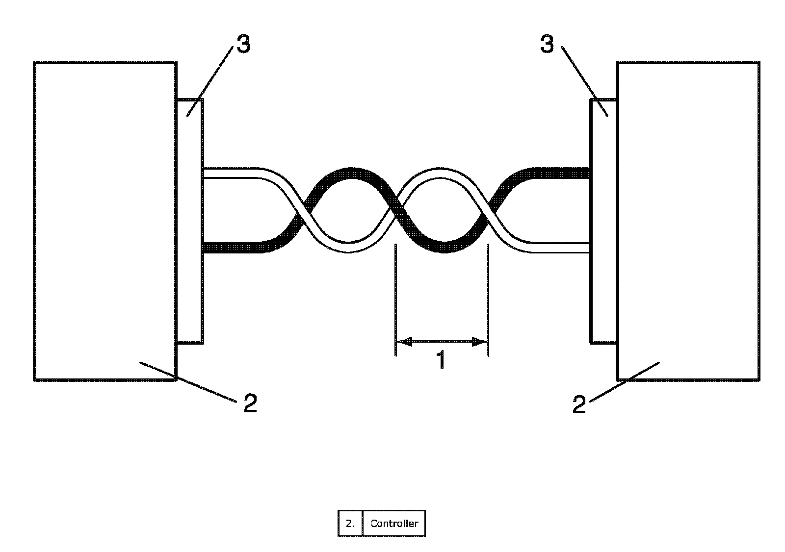 PRECAUTION FOR CAN COMMUNICATION SYSTEM- The loose (1) in the wire harnesses twist of the CAN lines except around the connector (3) should be within 100 mm (3.9 in.). Refer to the wiring diagram for the CAN lines discrimination. Excessively-loosed lines may be influenced by the electric noise.