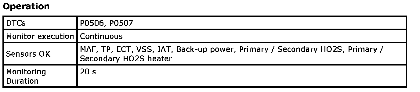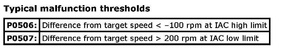 The Idle Air Control (IAC) solenoid functionally checked by monitoring the closed loop idle speed correction required to maintain the desired idle rpm. If the proper idle rpm cannot be maintained and the system has a high rpm (+200) or low rpm error (-100) greater than the malfunction threshold, an IAC malfunction is indicated. (P0507, P0506)