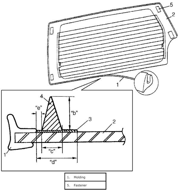 ^ Before applying primer to glass (2) edge, install molding (1) according to installing position shown in the figure.