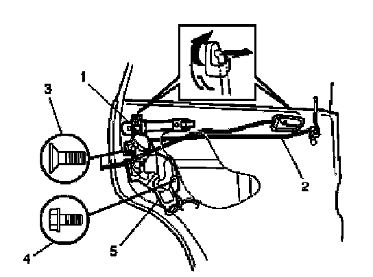 4. Loosen door latch mounting screw (3), door latch actuator bolt (4) and remove door latch Assembly (5).