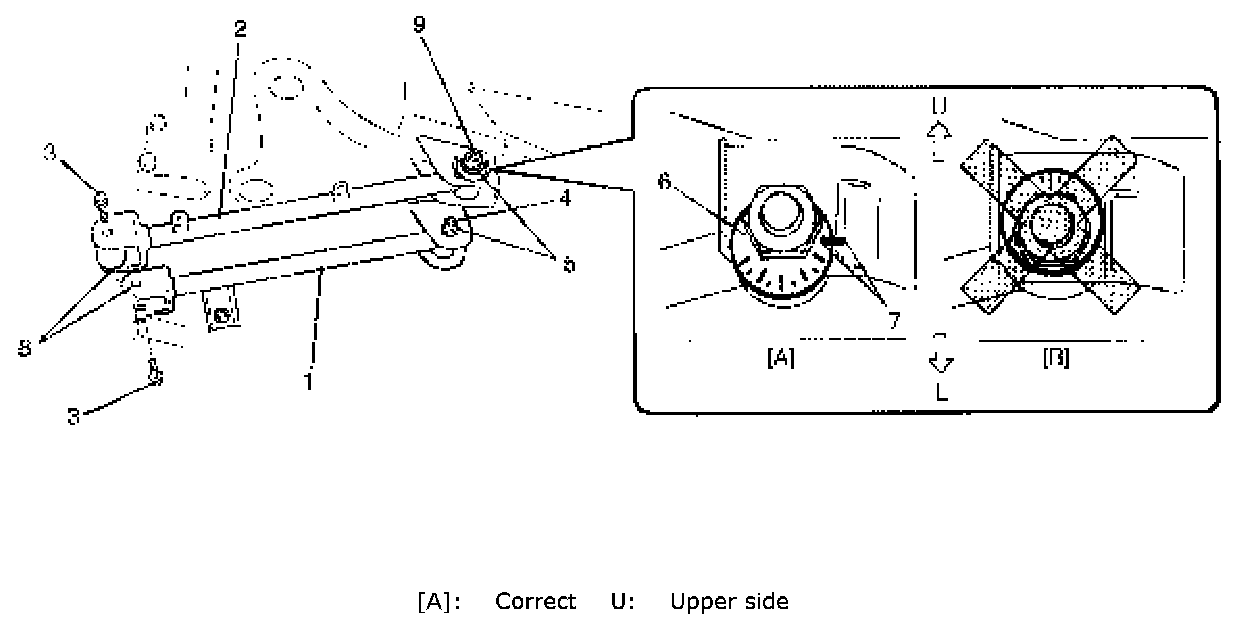 8) Check rear toe and adjust it as necessary. For check and adjustment procedures, refer to Rear Wheel Alignment Inspection and Adjustment.
