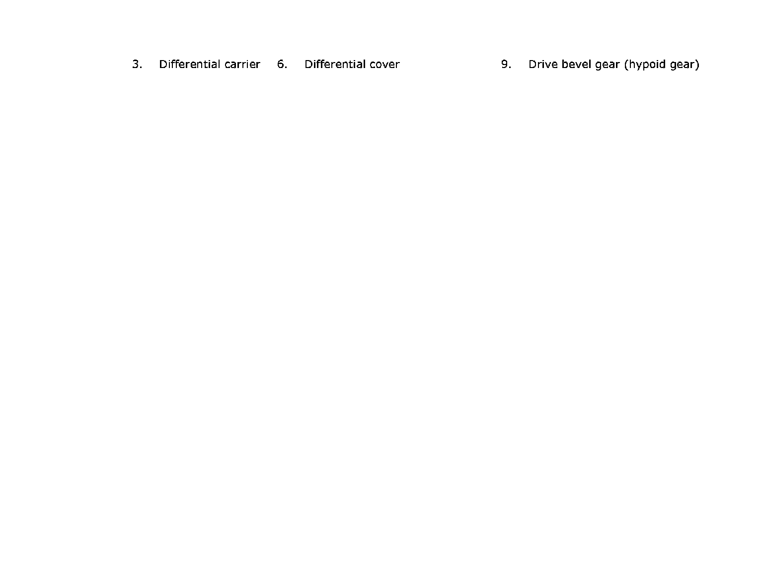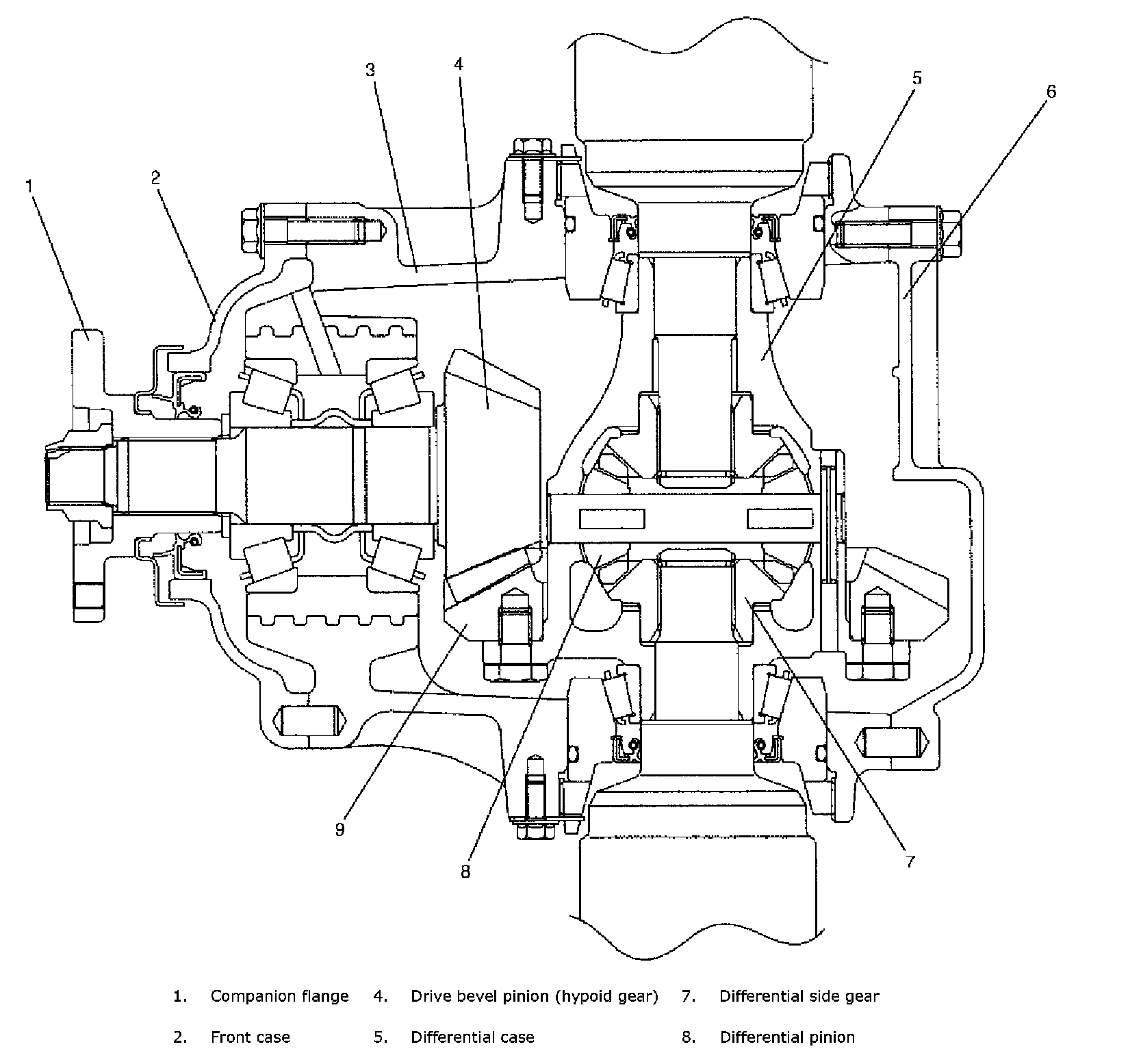 Rear Differential DescriptionThe differential assembly uses a hypoid bevel pinion and gear. The differential assembly is decisive in that the drive power is concentrated there. Therefore, use of genuine parts and specified torque is compulsory. Further, because of sliding tooth meshing with high pressure between hypoid bevel pinion and gear, it is mandatory to lubricate them by hypoid gear oil.