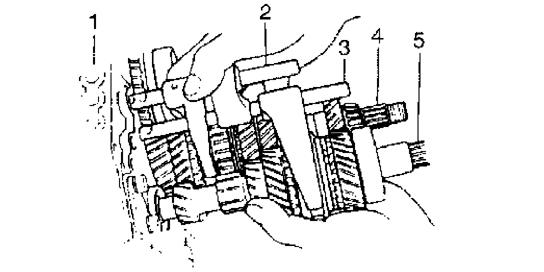 Left Case Assembly1. Join input shaft (5), countershaft (4), low speed gear shift shaft (2) and high speed gear shift shaft (3) assemblies all together, then install them into right case (1) so as not to damage oil seal by input shaft spline.
