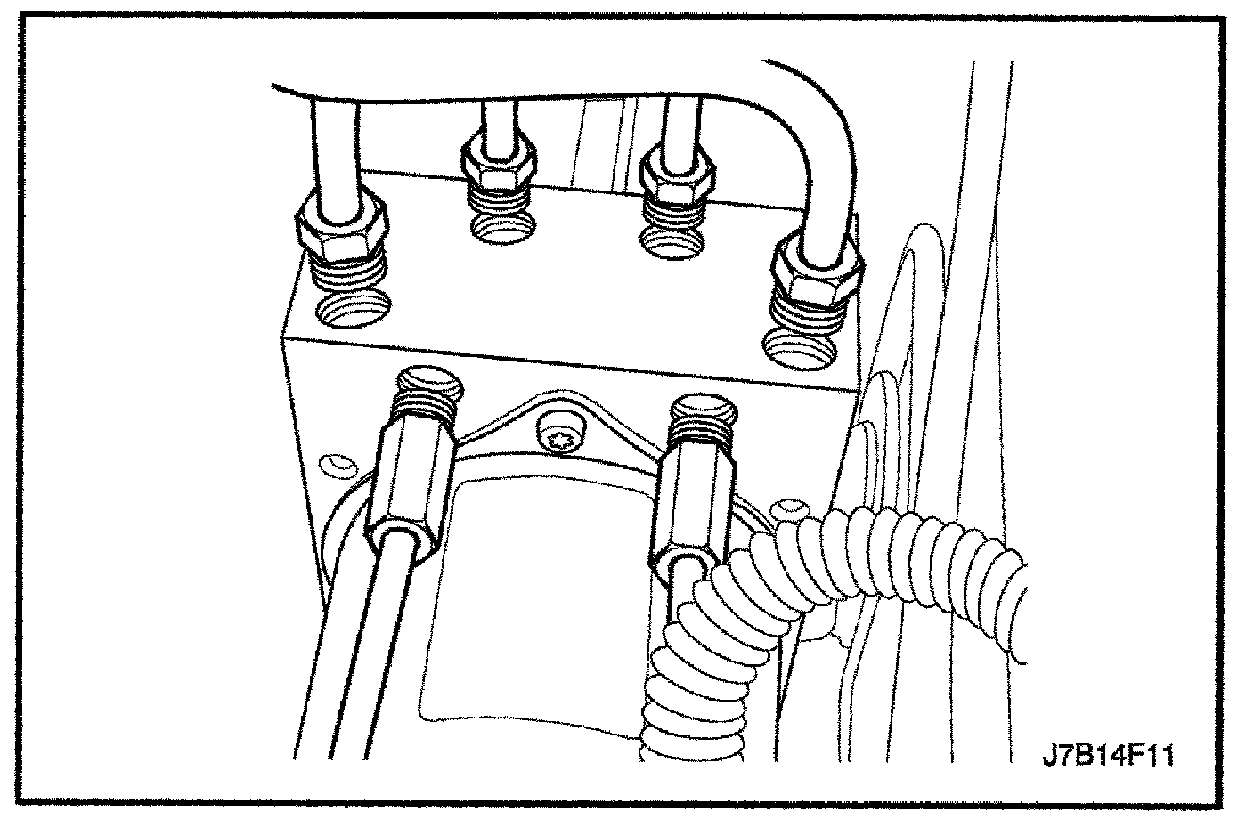 6. Move the brake pipes aside far enough to allow for lifting the ABS unit out of the mounting bracket.