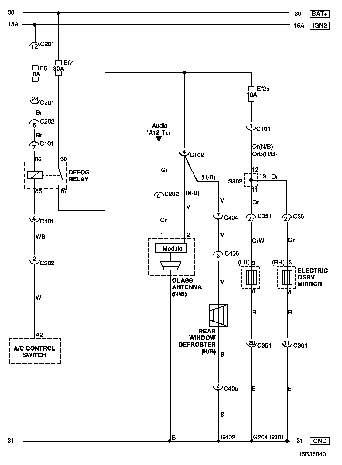 Rear Window Defroster and OSRV Mirror Heating System Circuit Wiring Diagram: