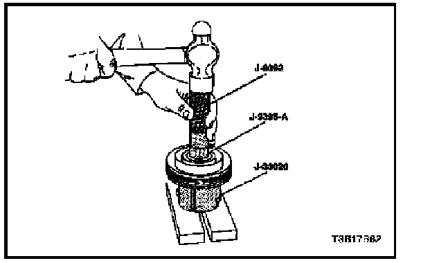 6. Position the pulley rotor and bearing installer J-33017 and the puller pilot J-33023-A directly over the inner race of the bearing.