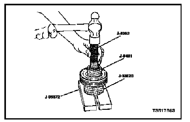 2. Align the new bearing squarely in the pulley bore. Use the bearing installer J-9481 and the driver handle J-8092, drive the bearing fully into the pulley bore.