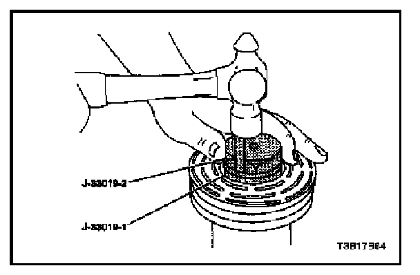 3. Place the bearing staking guide J-33019-1 and the bearing staking pin J-33019-2 in the rotor hub core. Shift the rotor and bearing assembly on the block to give full support to the hub under the staking pin. A heavy-duty rubber band may be used to hold the staking tool pin in the guide. The pin should be properly positioned in the guide after each impact on the pin.
