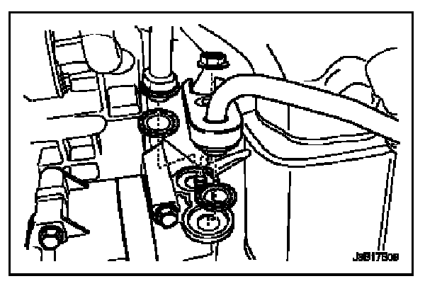 Tighten: Tighten the refrigerant discharge hose block-to-compressor retaining nut to 33 Nm (24 ft. lbs.).