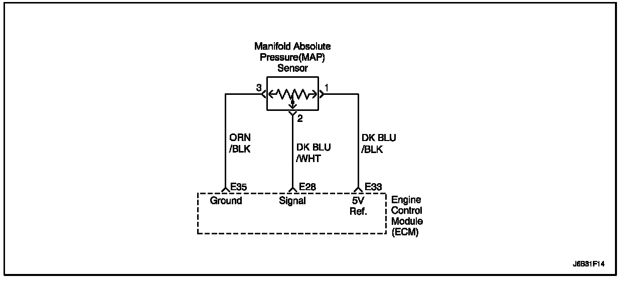 The Manifold Absolute Pressure (MAP) sensor measures the changes in the intake manifold pressure which result from engine load (intake manifold vacuum) and RPM changes. The MAP sensor converts these changes into a voltage output. The Engine Control Module (ECM) sends a 5 volt reference voltage to the MAP sensor. As the intake manifold pressure changes, the output voltage of the MAP sensor also changes. A low voltage (high vacuum) output of 1 - 2 V is present at idle. A high voltage (low vacuum) output of 4.0 - 4.8 V is present at wide open throttle. The MAP sensor is also used under certain conditions to measure barometric pressure. This allows the ECM to make adjustments for altitude changes. The ECM uses the MAP sensor for fuel delivery and ignition timing changes.