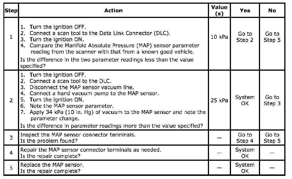 1. Applying 34 kPa (10 in. Hg) of vacuum to the MAP sensor should cause the parameter to change. Subtract the second parameter reading from the first. That parameter value should be more than 25 kPa. When applying vacuum to the MAP sensor, the change in the parameter should happen instantly. A slow parameter change indicates a faulty MAP sensor.