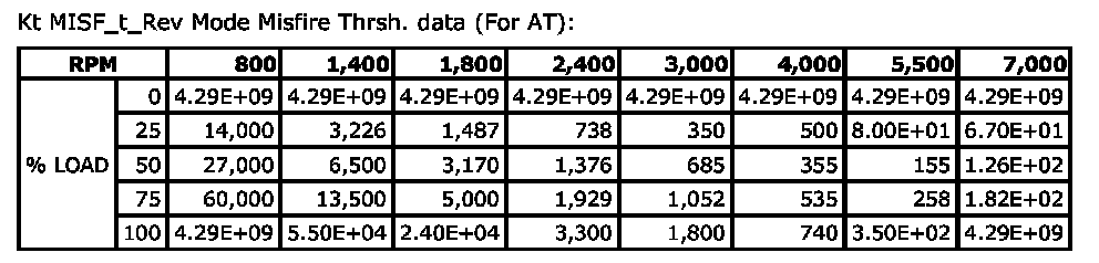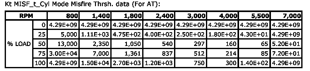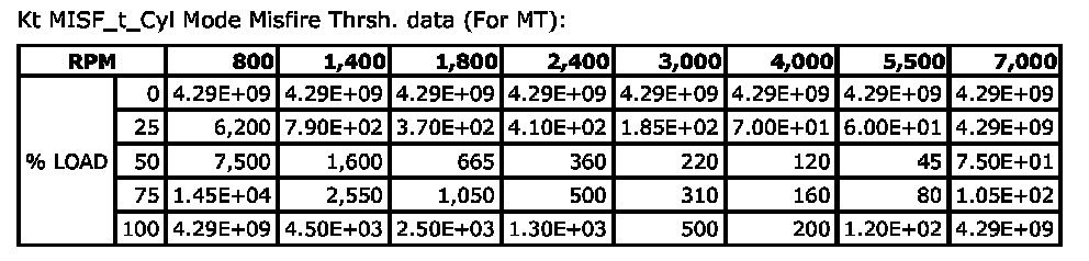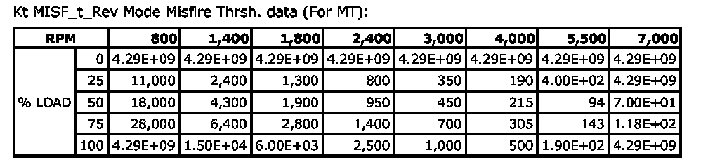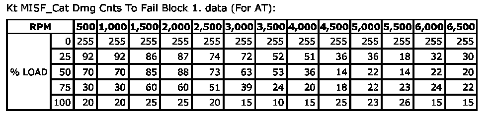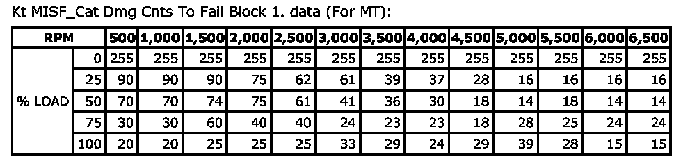 Catalyst damaging: # of misfires (See table above.) based on RPM and Load in 1 out of 16,100 engine cycle analysis blocks more than 3 times inside FTP conditions (misfire % load <= 75 AND RPM <= 3,200 rpm) or just once (1. outside FTP conditions. See broken web link.