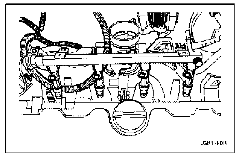 Tighten the fuel rail retaining bolts to 25 Nm (18 ft. lbs.).