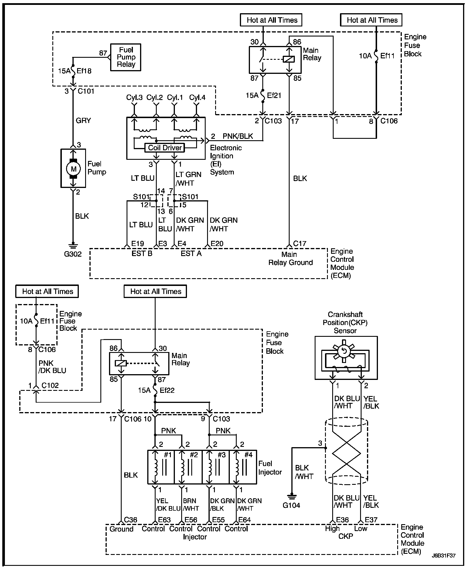 2. It is important to check for the presence of spark from all of the ignition wires. If spark is present from one to three of the ignition coil terminals, the Crankshaft Position (CKP) sensor is OK.