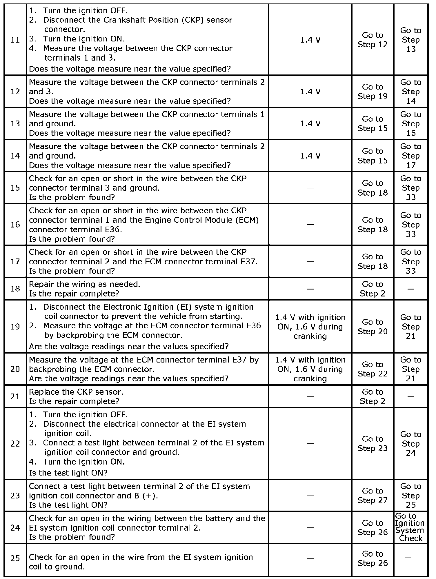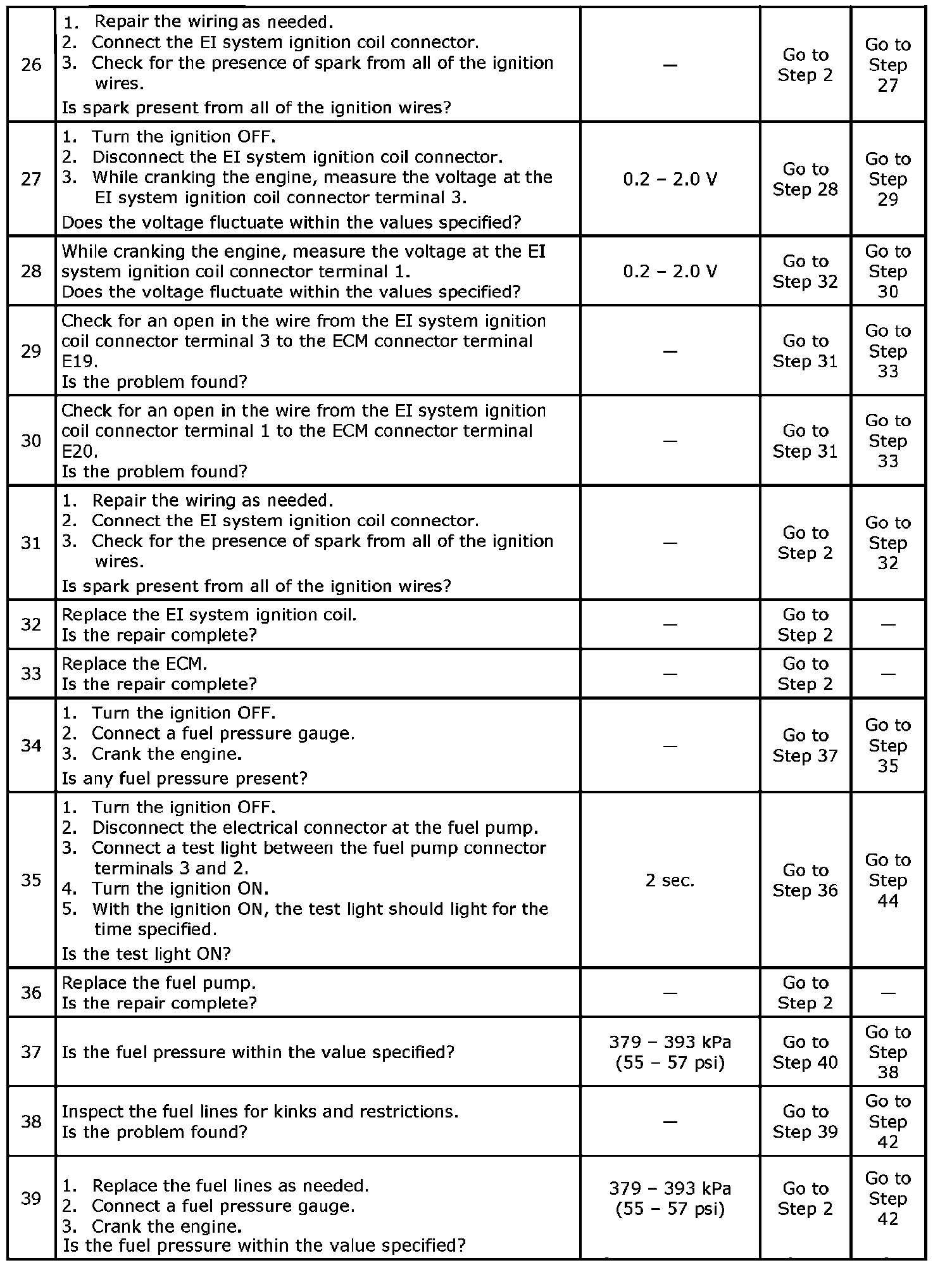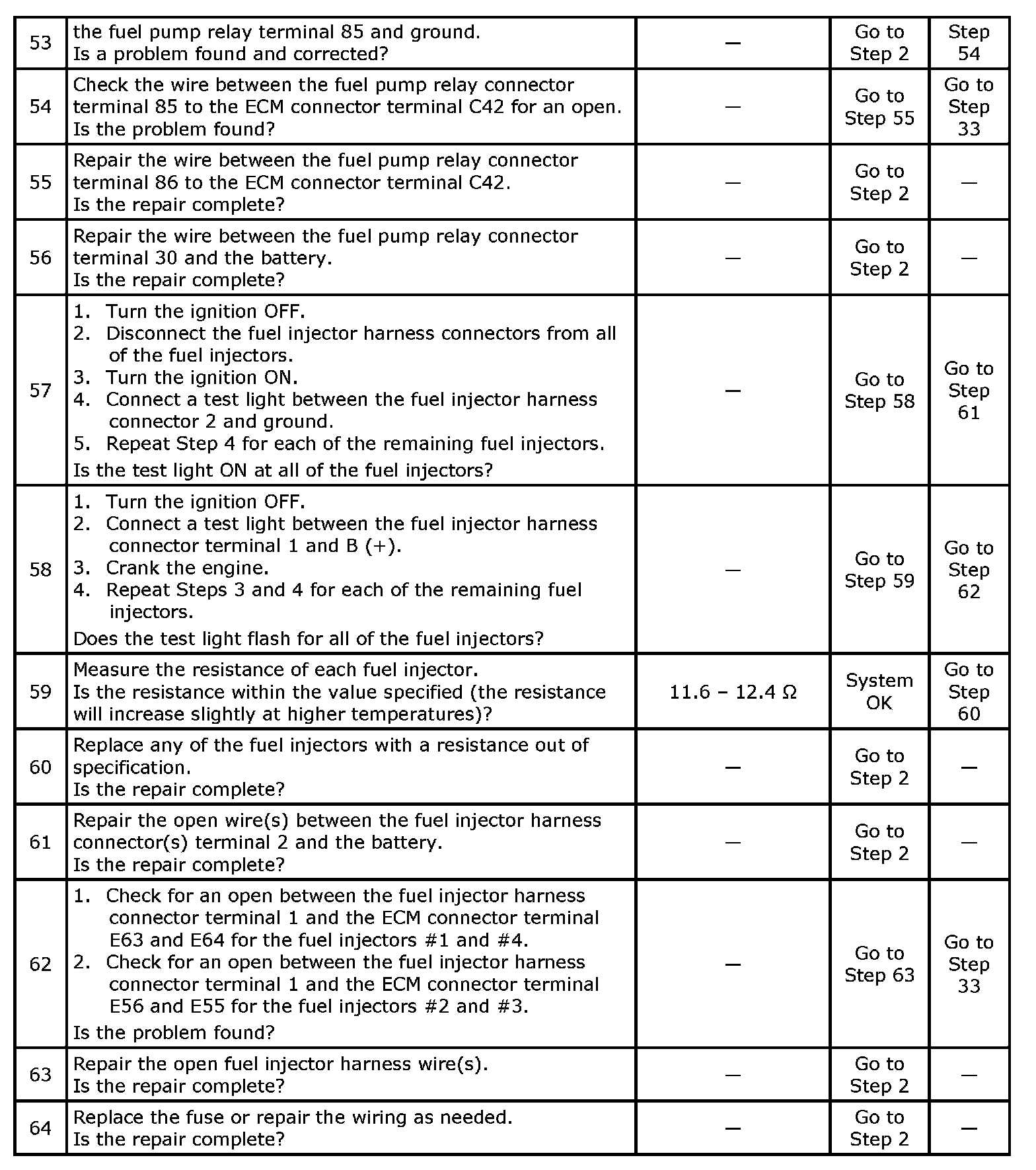 5. This step checks for a ground signal being supplied by the ECM to operate the fuel injectors.If there is no ground present during the cranking of the engine, and the fuel injector wiring is OK, the ECM is at fault.