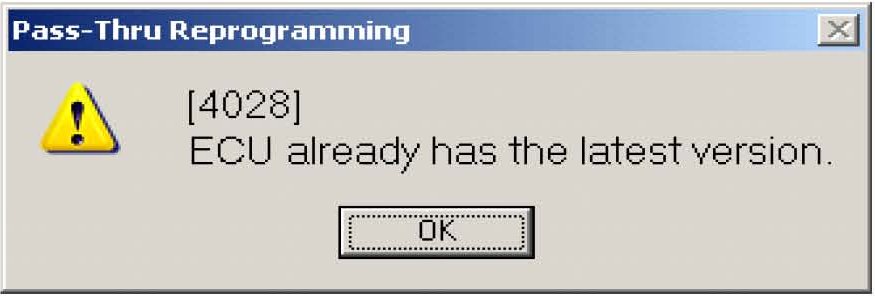 5. Following the procedures outlined in the Suzuki Pass-Thru Reprogramming Tool Operator's Manual, hook up the SDS Interface Tool P/N 09910-06520 to the vehicle and run the ECM reprogramming software. Continue to step 6. If the message "[4028] ECU already has the latest version" appears, click "OK". No further action is required. The glove box label should already be in the glove box.