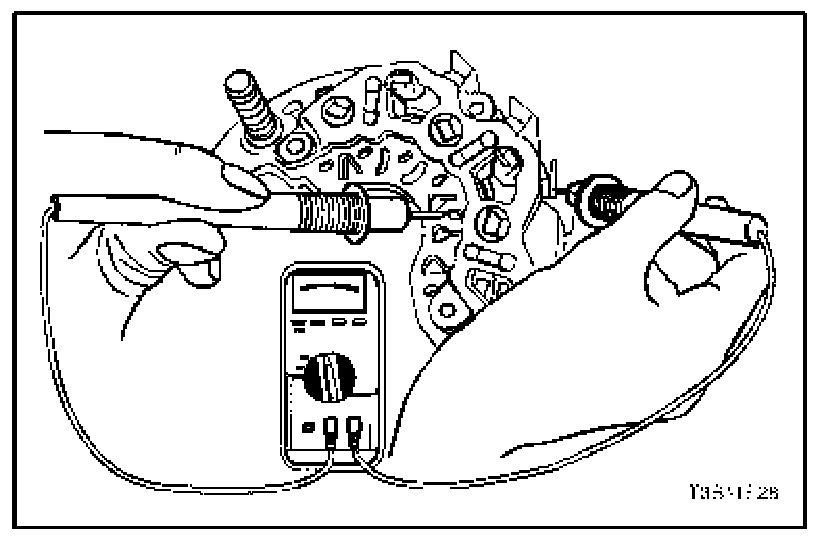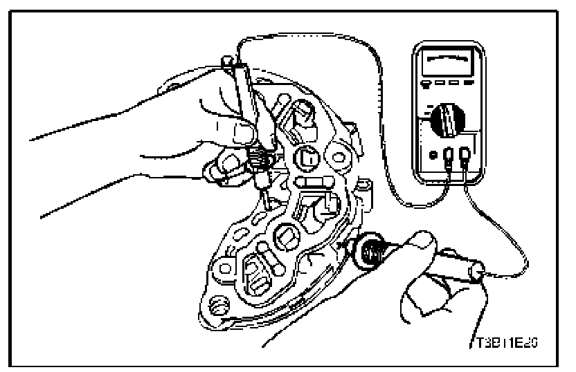8. Test the rectifier bridge by connecting the ohmmeter terminals to the bridge and the heat sink.