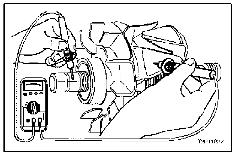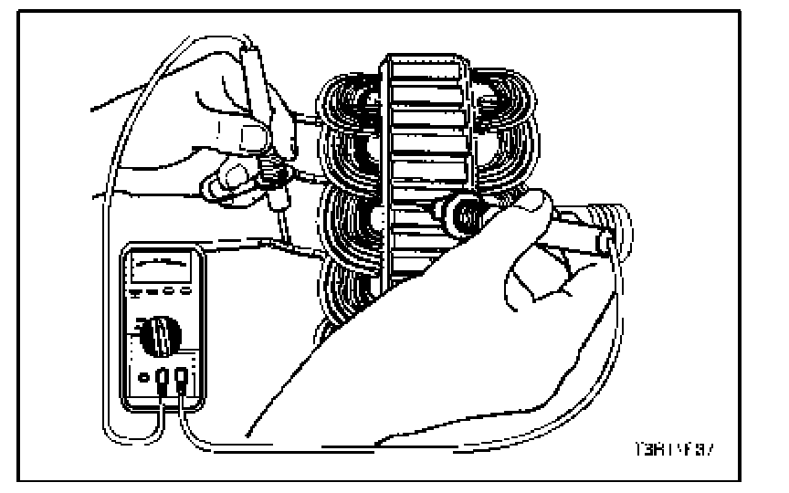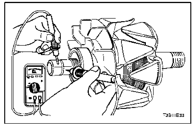 17. Test the rotor for open and short circuits. The reading should be 1.7 to 2.3 ohms, or the rotor should be replaced.