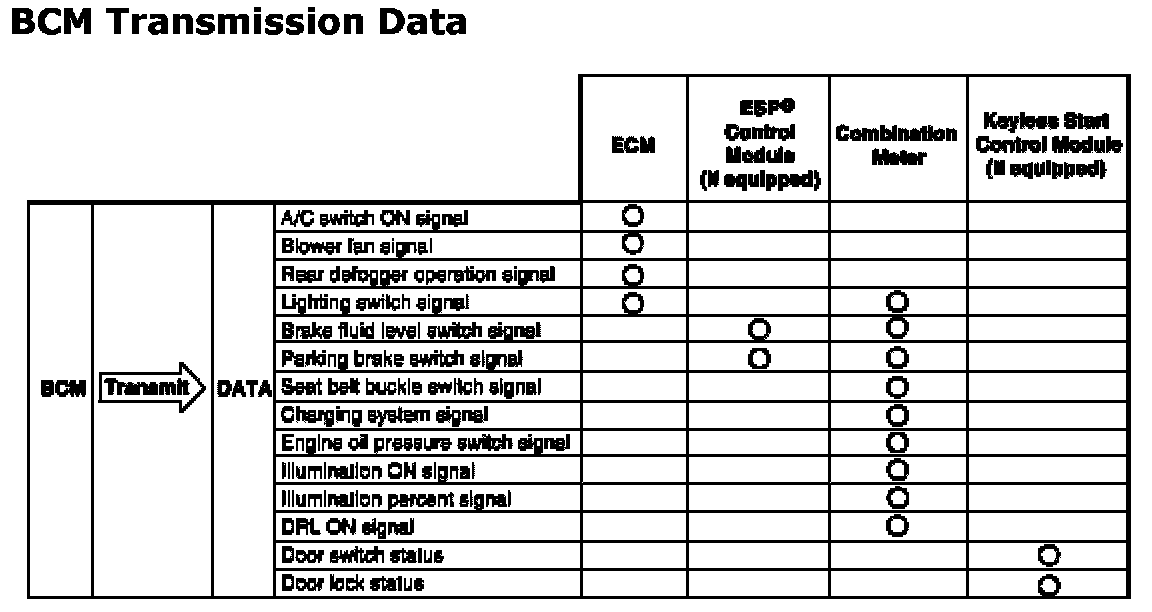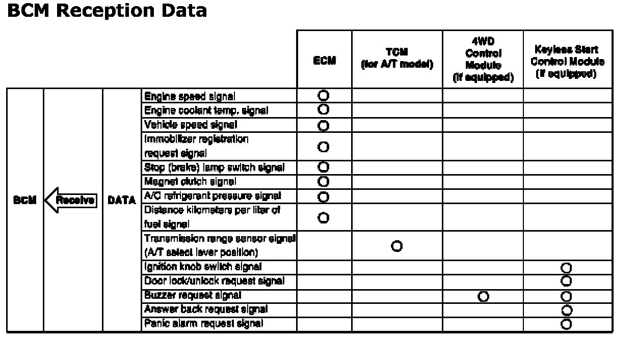 CAN Communication for BCMBCM communicates with each of ECM, TCM (if equipped), keyless start control module (if equipped), 4WD control module (if equipped), ESP(R) control module (if equipped) and combination meter about the following data. For details of CAN communication, refer to CAN Communication System Description.
