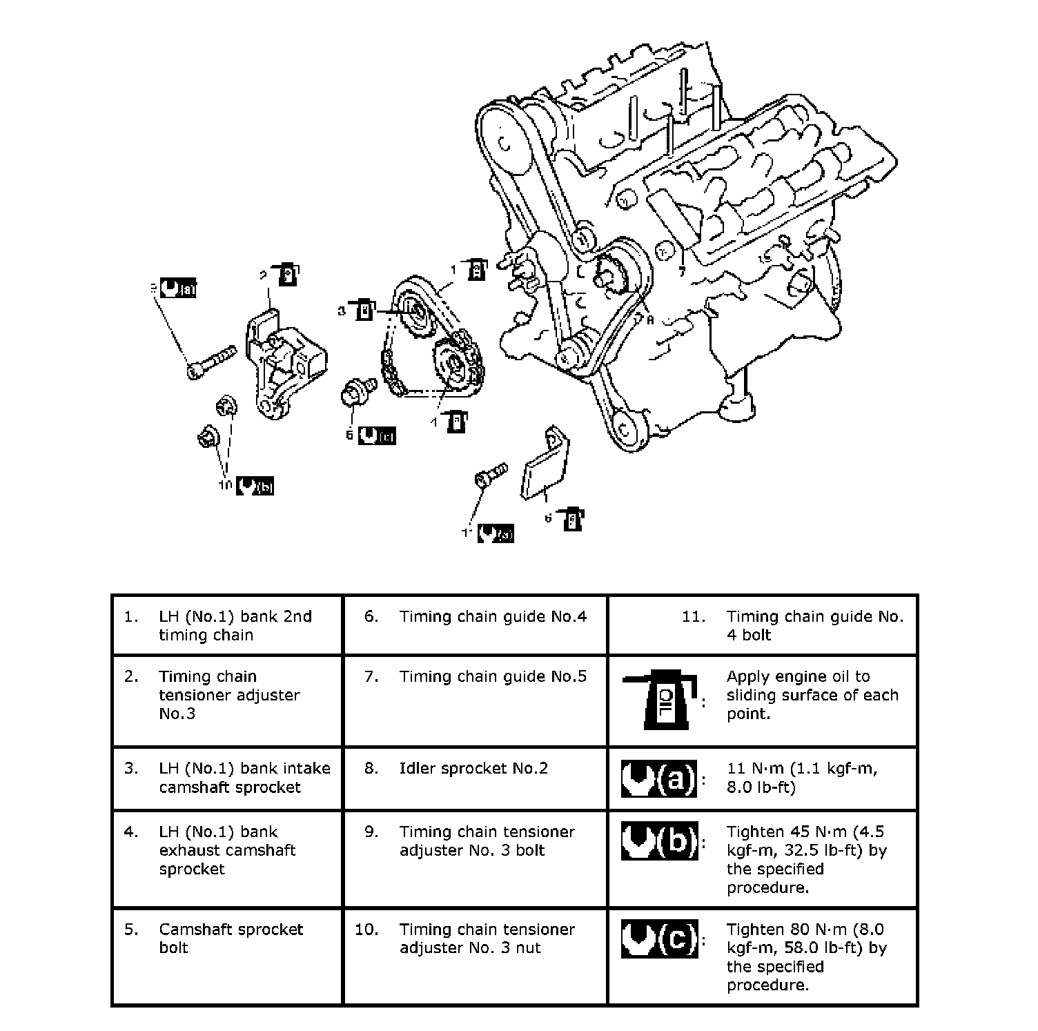 Timing chain tensioner adjuster No.3 bolt c: Tighten 11 Nm (1.1 kgf-m, 7.5 ft. lbs.) by the specified procedure