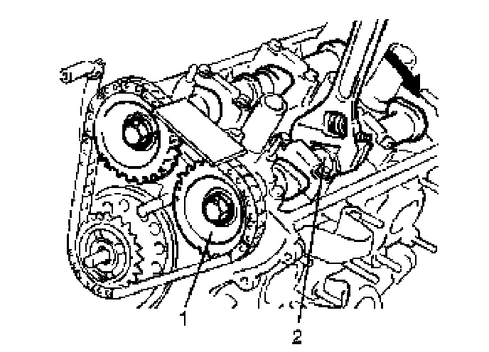 To remove it, slacken LH (No.1) bank 2nd timing chain by turning intake camshaft (2) counterclockwise a little while pushing back pad.