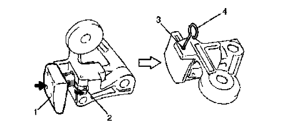 8) With latch (2) of tensioner adjuster No.3 returned and plunger (1) pushed back into body, insert stopper (pin) (4) into set hole (3).