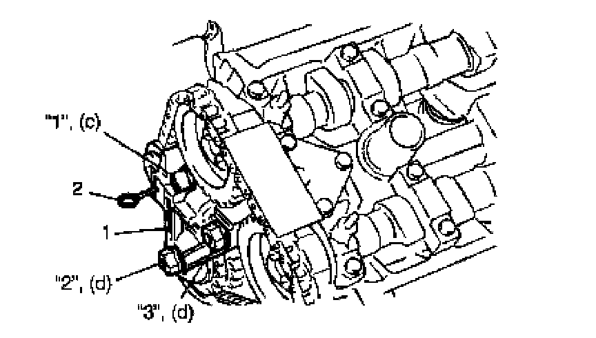 Timing chain tensioner adjuster No.3 nut d: Tighten 45 Nm (4.5 kgf-m, 32.5 ft. lbs.) by the specified procedure Tightening order for tensioner bolt and nuts: "1" -> "2" -> "3"