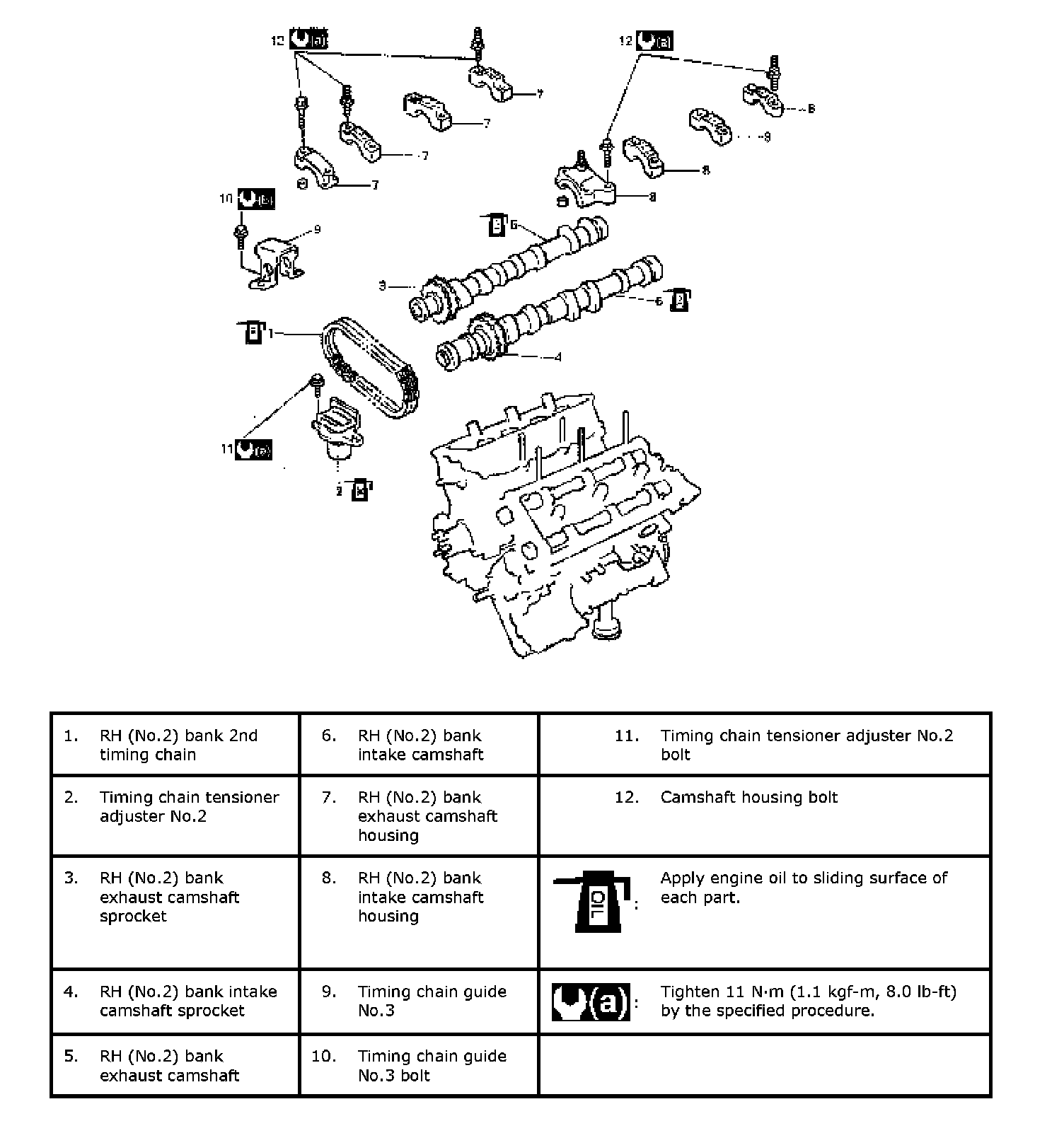 Timing chain tensioner adjuster No.2 bolt a: 11 Nm (1.1 kg-m, 8.0 ft. lbs.)