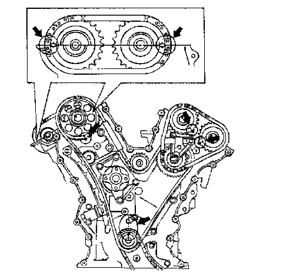 12) Apply oil to timing chains, tensioner adjusters sprockets and guides.