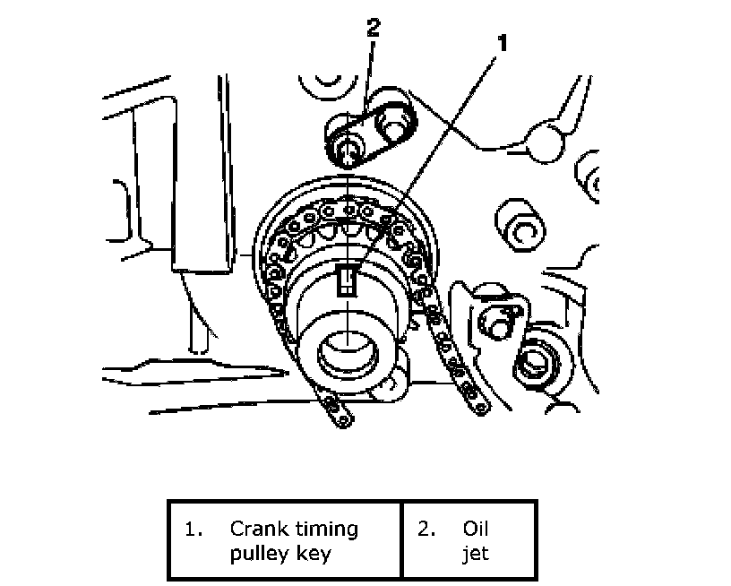 11) Turn crankshaft two rotations clockwise then align timing pulley key (1) on crankshaft and oil jet (2) on cylinder block as shown in figure.