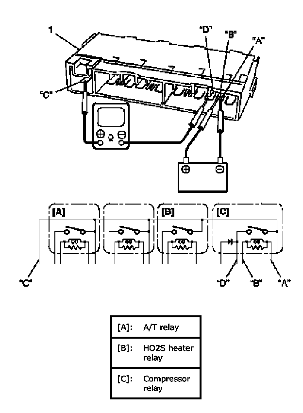 4. Connect battery positive (+) terminal to terminal "B" of relay. Connect battery negative (-) terminal to terminal "A" of relay. Check for continuity between terminal "C" and "D". If there is no continuity when relay is connected to the battery, replace integration relay No.2 (1).