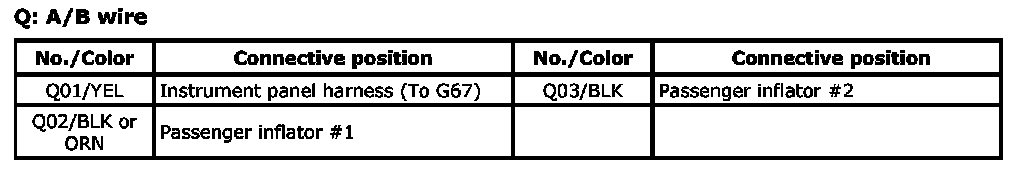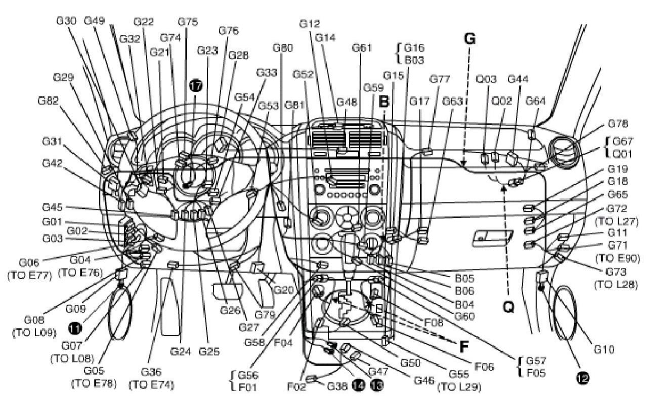 B A/C Wire / F Console Wire / G Instrument Panel Harness / Q A/B Wire View: