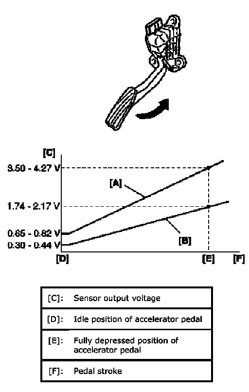 3. Measure output voltage variation while accelerator pedal is no depressed and fully depressed as following specification.